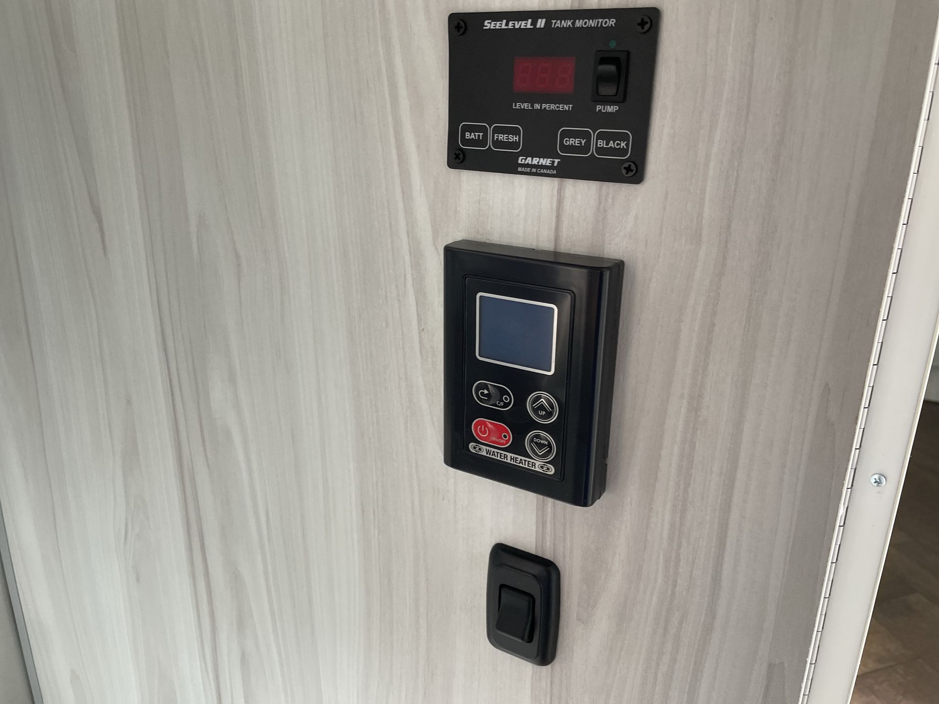 The bathroom offers a shower, porcelain toilet, and vanity, providing the conveniences of home on the road. Water-saving features and ample storage for toiletries enhance the practicality of the space.