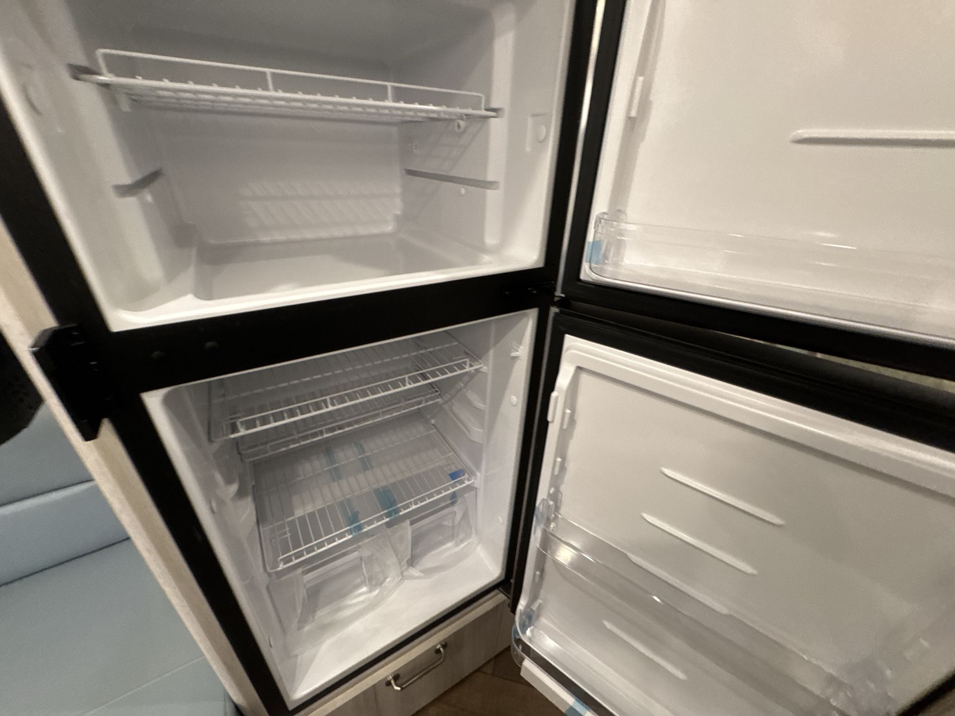 Comfort is a priority, with an efficient climate control system featuring both heating and air conditioning to maintain the perfect temperature year-round. The spacious bathroom includes a separate shower, toilet, and vanity, providing the conveniences of home on the road.