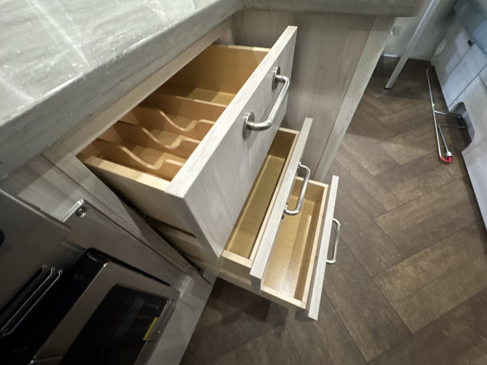 The living area is designed for relaxation and socializing, equipped with a comfortable lounge and a convertible dinette that easily transforms into additional sleeping space. The well-equipped kitchen includes a three-burner stove, oven, microwave, and a mid-size refrigerator, all complemented by solid surface countertops and a deep sink, making meal preparation convenient.