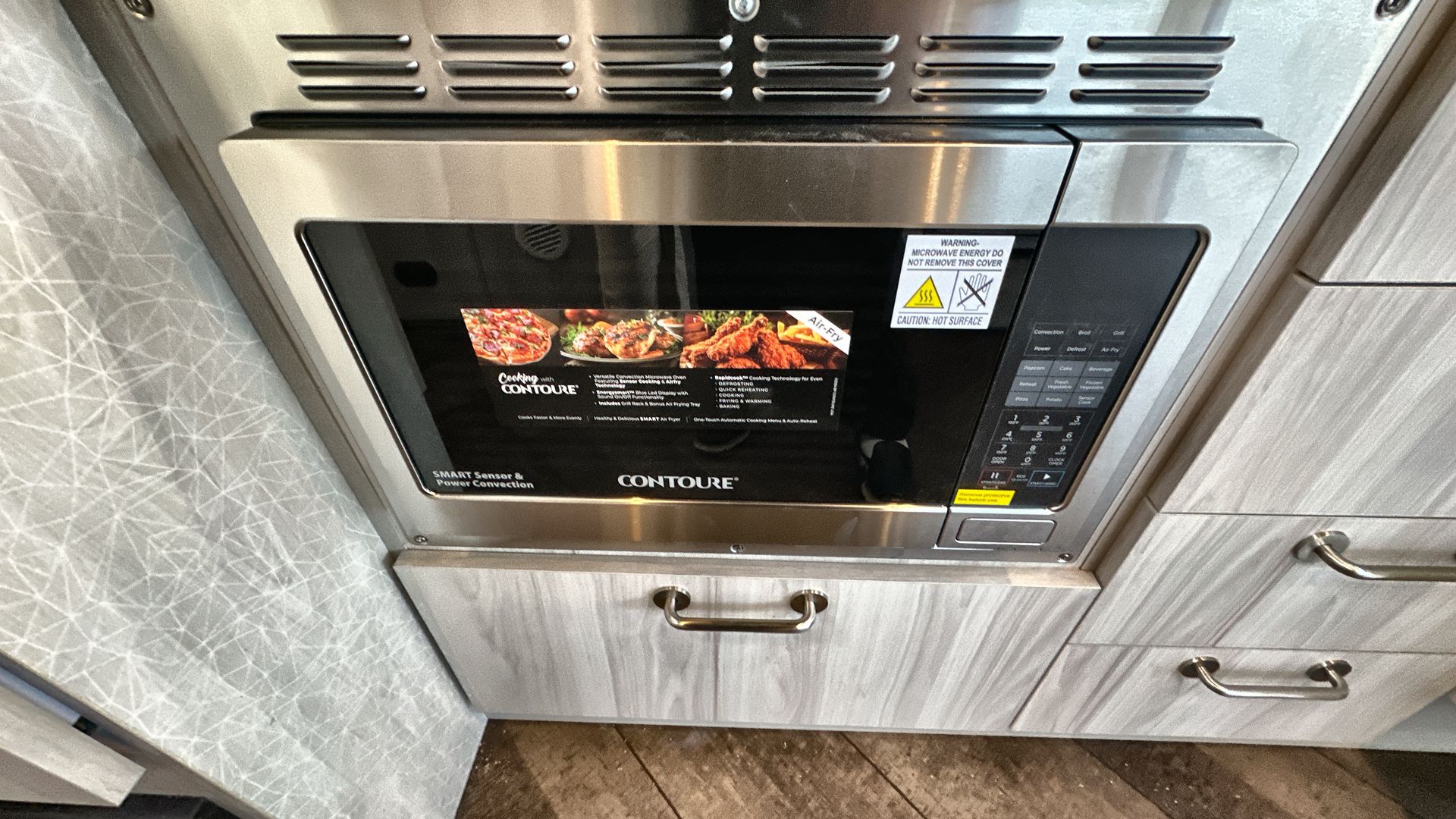 The living area is designed for relaxation and socializing, equipped with a comfortable lounge and a convertible dinette that easily transforms into additional sleeping space. The well-equipped kitchen includes a three-burner stove, oven, microwave, and a mid-size refrigerator, all complemented by solid surface countertops and a deep sink, making meal preparation convenient.