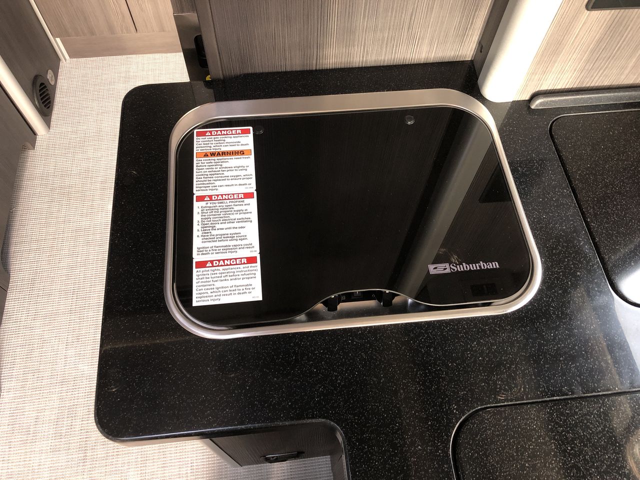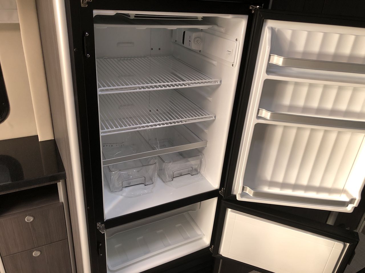 The kitchen is equipped with high-end appliances, including a two-burner gas stove, a convection microwave oven, and a mid-size refrigerator with a freezer. Solid-surface countertops, a large stainless steel Kohler® sink, and a slide-out pantry enhance both functionality and style, making it easy to prepare homemade meals on the road.