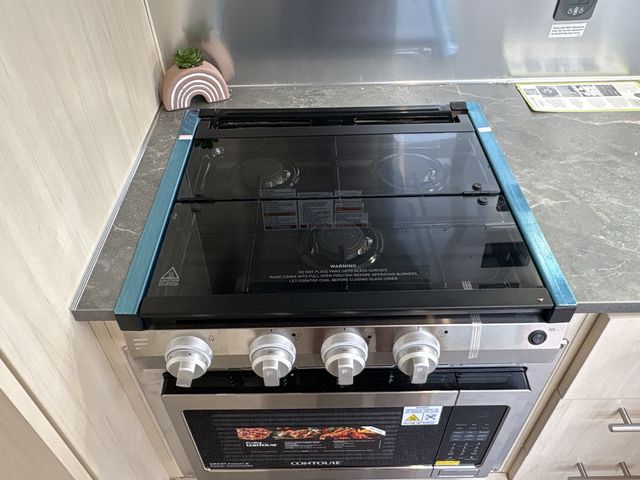 Inside, the thoughtfully designed layout maximizes space and comfort. At the front, twin beds provide a cozy sleeping area, with a center aisle that opens up the space and offers additional storage options underneath. The main living area includes a convertible dinette that comfortably seats four and can be transformed into an extra sleeping space when needed. Adjacent to the dinette, a lounging area with a wall-mounted TV creates a perfect spot for relaxation.