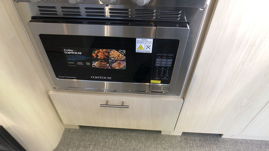 The kitchen is equipped with modern appliances, including a three-burner stove, convection microwave with air fryer, and a mid-size refrigerator, making meal preparation convenient and enjoyable. The stainless-steel sink and polished countertops add both functionality and elegance to the space.