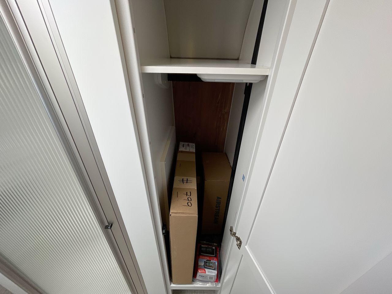 The bathroom setup includes a separate shower and a half-bath with a toilet and vanity, offering the convenience and privacy of home. Quality fixtures and a heated towel bar add a touch of elegance to the space.
