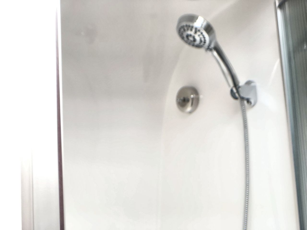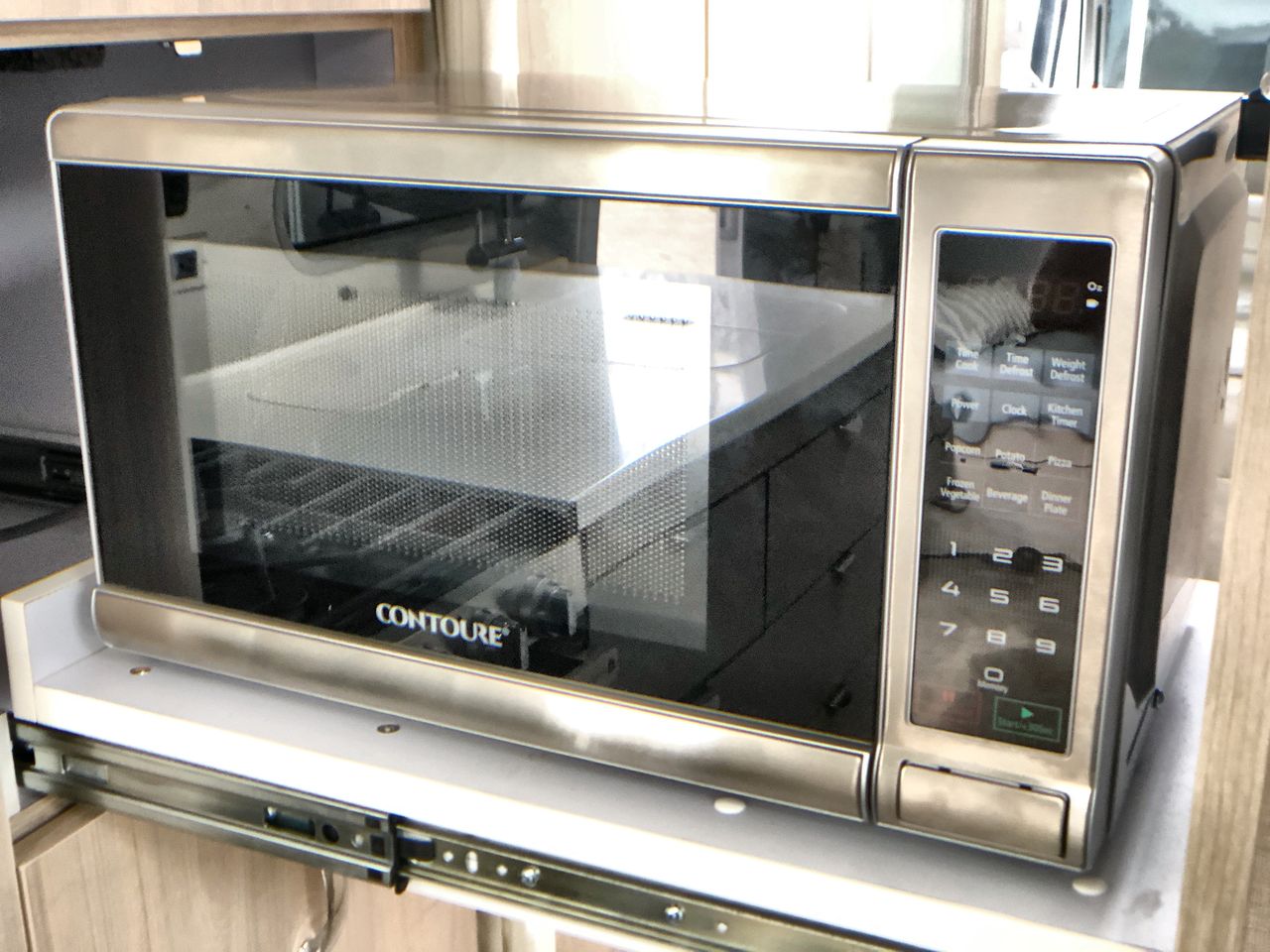 The kitchen is equipped with high-quality appliances, including a three-burner LP cooktop, oven, microwave, and a large refrigerator. Ample cabinet space ensures you have plenty of room to store all your cooking essentials, making meal preparation convenient whether you're at a campsite or on the road.