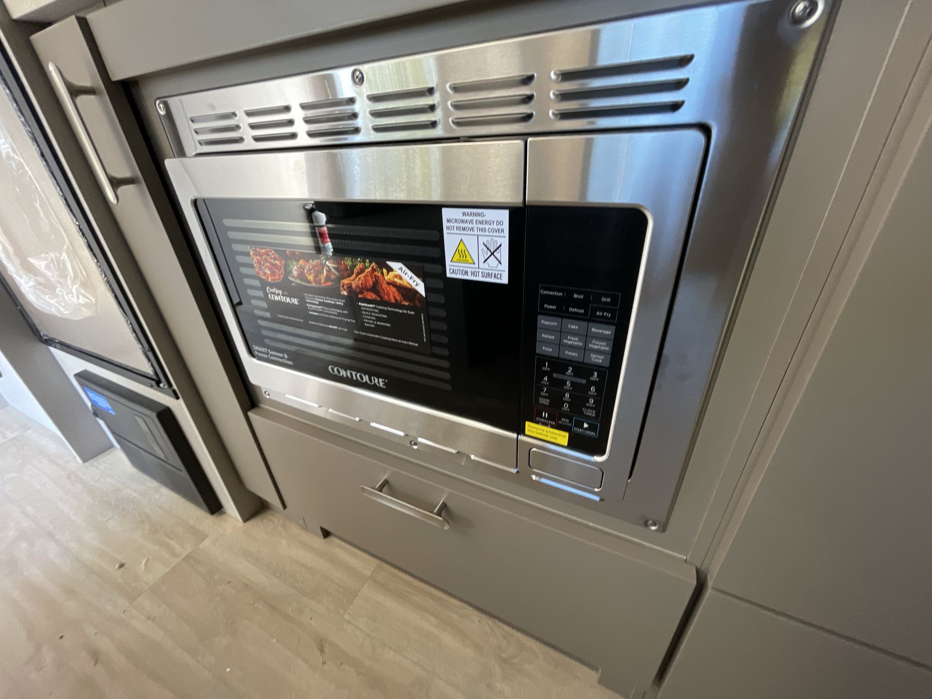 The central living area includes a U-shaped dinette that converts into an additional sleeping space, accommodating up to four people in total. The kitchen is equipped with a three-burner gas stove, convection microwave, compact refrigerator, and ample counter space, making meal preparation convenient.