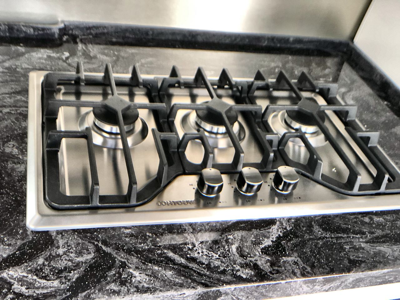 The kitchen is equipped with modern appliances, including a high-end stove, oven, convection microwave, and a large refrigerator. The ample counter space and storage make meal preparation both simple and enjoyable, catering to all your culinary needs on the road.