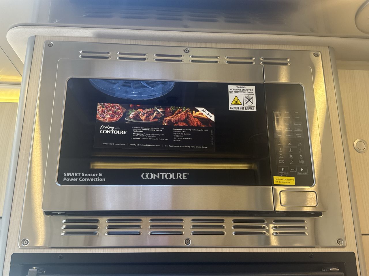 The kitchen is equipped with high-end appliances, including a two-burner gas stove, a convection microwave oven, and a mid-size refrigerator with a freezer. Solid-surface countertops, a large stainless steel Kohler® sink, and a slide-out pantry enhance both functionality and style, making it easy to prepare homemade meals on the road.
