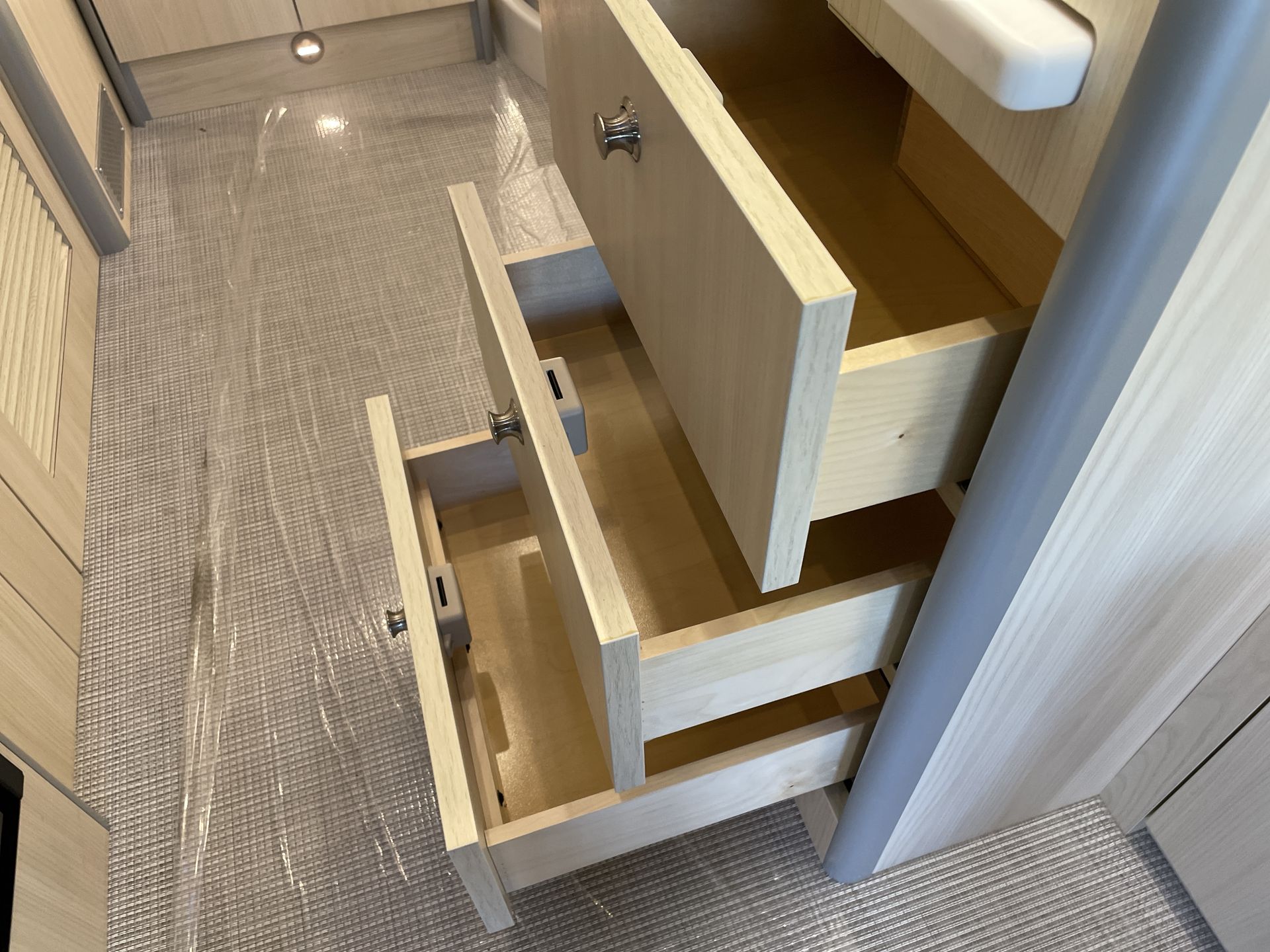 Inside the Murphy Suite, the innovative design maximizes space without compromising on luxury. The powered slide-out transforms the lounge area into a spacious living space. During the day, relax on the plush reclining sofa with two power seats. At night, the Murphy bed conveniently folds down, creating a cozy sleeping area without occupying additional space. This smart use of space makes the Atlas ideal for couples or solo travelers who value versatility.