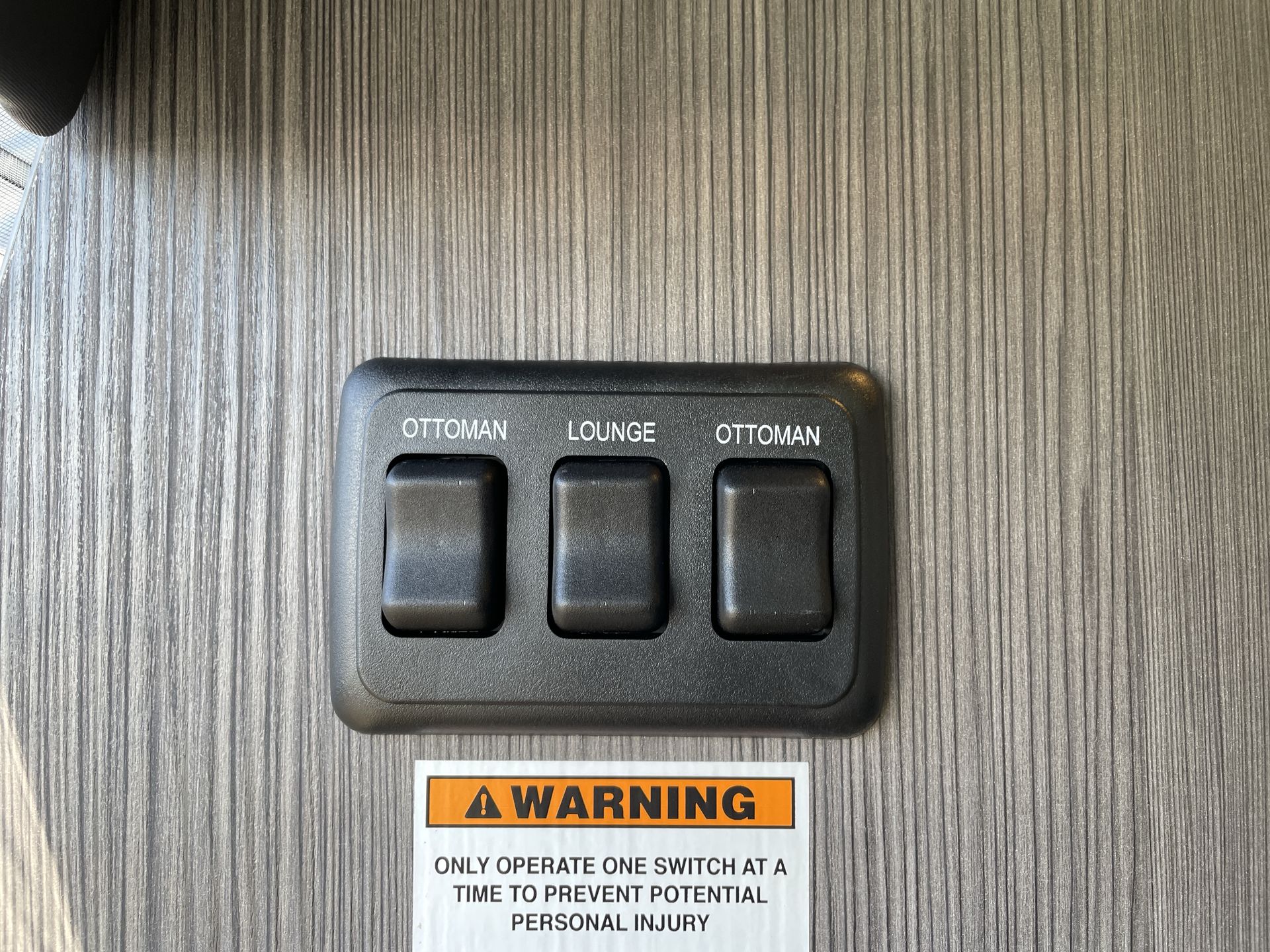 The exterior of the 24GT features a brilliant silver metallic finish that exudes sophistication. A large sliding door provides easy access, while a powered awning extends over the entrance, creating a welcoming outdoor space for relaxation.