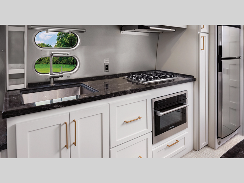 Each model is constructed with a semi-Monocoque aluminum superstructure, an enclosed aluminum insulated and heated underbelly, plus many more durable construction materials so you can enjoy your Classic travel trailer for years to come. You will love the handcrafted interior cabinetry, the panoramic front windows with blackout shades, and the seamless luxury woven vinyl flooring, plus these models feature the most storage of any Airstream so you don't have to sacrifice what you bring along. The residential-style kitchen is packed with luxury and convenience with its Kohler faucet, Corian countertops, and a large stainless steel sink!