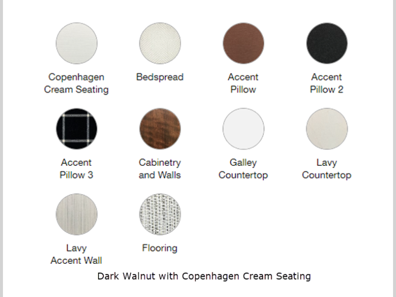 Sleeps 4 Length 28 ft 2 in Ext Width 8 ft 6 in Ext Height 9 ft 7 in Int Height 6 ft 7 in Interior Color Dark Walnut with; Copenhagen Cream, Dublin Slate. Dark Elm with; London Grey, Barcelona Blue Hitch Weight 875 lbs GVWR 7600 lbs Dry Weight 6300 lbs Cargo Capacity 1300 lbs Fresh Water Capacity 39 gals Grey Water Capacity 39 gals Black Water Capacity 39 gals Tire Size ST225/75R15 Furnace BTU 30000 btu Available Beds RV Queen Refrigerator Type 12V w/Freezer Refrigerator Size 8 cu ft Cooktop Burners 3 Number of Awnings 1 LP Tank Capacity 30 lbs Water Heater Type Tankless On Demand LP AC BTU 15000 btu TV Info LR 27" 12V DC Smart TV, BR 24" 12V DC Smart TV Awning Info Powered Zipdee with Sunbrella Fabric; Rear & Roadside Window Awnings Axle Count 2 Number of LP Tanks 2 Shower Type Shower w/Seat Electrical Service 30 amp Similar Floorplans