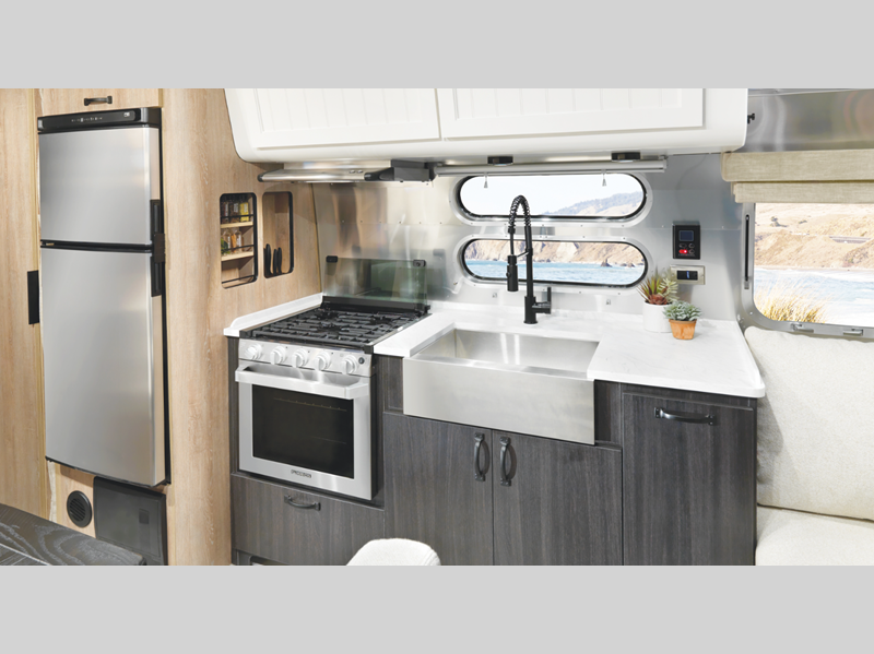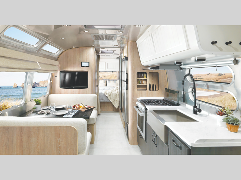 Not only will you find high craftsmanship that you have grown to respect from Airstream, but now you will also find the trademark style and design expertise that Pottery Barn is known for. The residential bathroom is complemented by wall sconces, and the Pottery Barn accessory kit includes a folding table and armchair set, a 16-piece Mason Stoneware dinnerware set, a doormat, storage bins, and more. You will even find a solid oak wood table at the dinette that will last for generations to come!